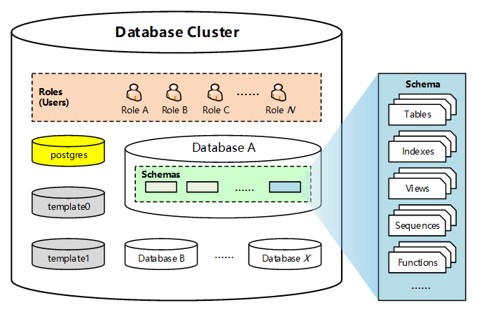 PostgreSQL的逻辑结构采用层级式设计,从高到低依次为:数据库集群→数据库(Database)→模式(Schema)→数据库对象(表/视图/函数等),其中多个数据库可以共享同一实例但它们之间相互隔离,模式作为命名空间管理对象,用户和角色全局统一管理权限。