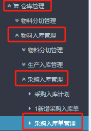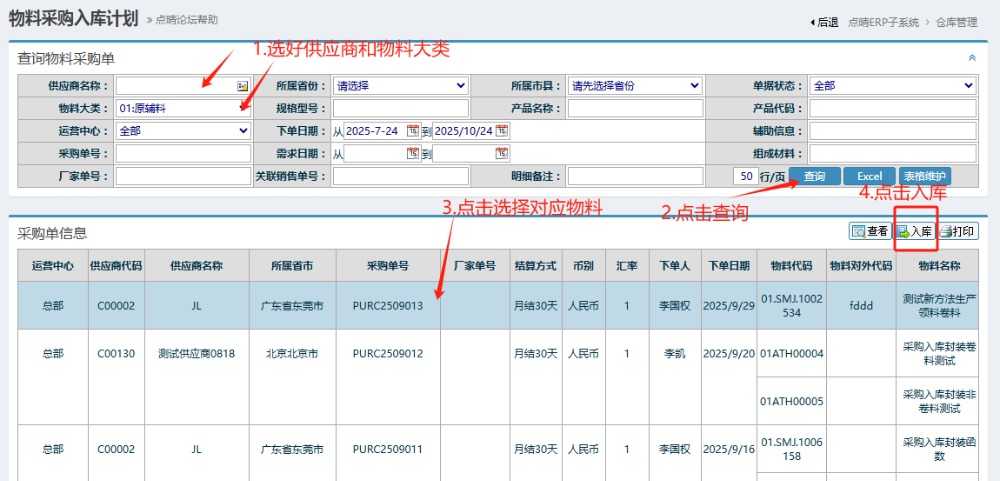 点晴ERP-新增采购入库单教程 进入ERP系统,在左侧或者是上方菜单栏上找到”仓库管理“》”物料入库管理“》”采购入库管理“》”采购入库计划“ 2.进入页面后,按图操作:选好供应商和物料大类,点击查询。然后点击选择对应物料,点击入库。 3.点击入库后跳转到”新增采购入库单“页面,按图操作:选好入库仓库,确认好...