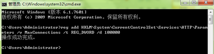 reg add HKLM\System\CurrentControlSet\Services\HTTP\Parameters /v MaxConnections /t REG_DWORD /d 100000