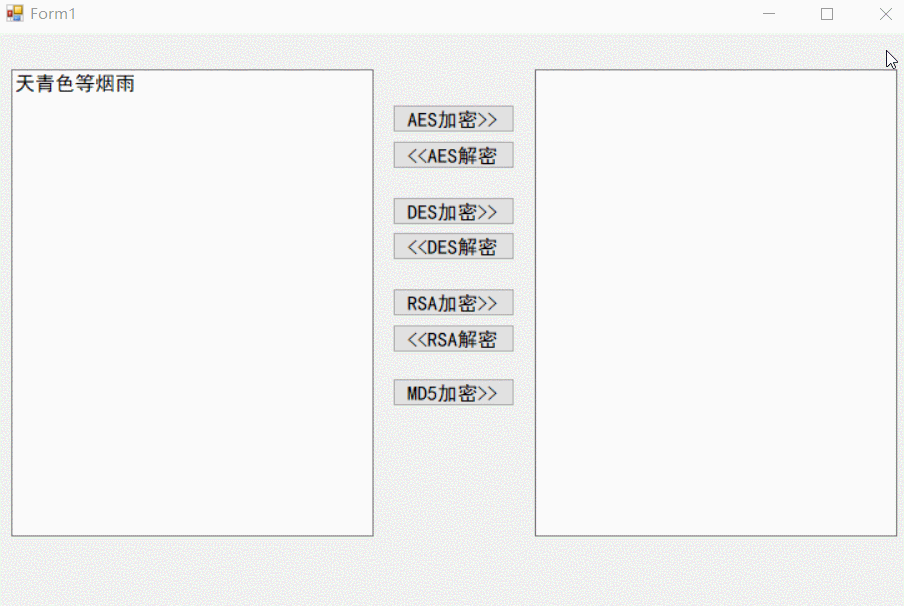 private void btn_Des_Encrypt_Click(object sender, EventArgs e)        {            string result = DesUtil.Encrypt(textBox1.Text, "12345678900987654321");            textBox2.Text = result;        }