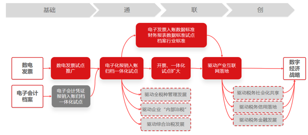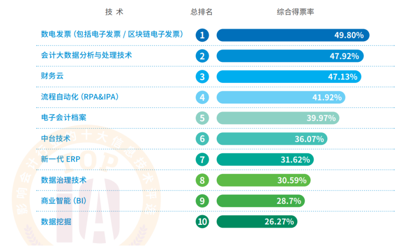 对于会计行业从业者来说更多关注的可能会是政策准则的合规、办公效率提升、数据精准性、场景化应用等诉求,技术层感知可能会有些许欠缺,就如同在售前时再去过多强调平台的先进性,客户是很少会有感知和认同的。 十项技术中广为周知的是数电发票、电子会计档案、商业智能、RPA,这些应用大家多多少少都会有一些接触;而谈到财务云、新一代ERP、会计大数据分析与处理技术、中台技术、数据治理或许感知并不深入,但这些确实已经在影响会计行业的发展的,随着技术在会计实际应用领域场景的不断深化和沉淀,以上的信息技术定会给会计从业人员越来越深化的感知。 1. 数电发票 全面数字化的电子发票(以下简称“数电发票”)是与纸质发票具有同等法律效力的全新发票,不以纸质形式存在、不用介质支撑、不需申请领用。纸质发票的票面信息全面数字化,多个票种集成归并为电子发票单一票种,设立税务数字账户,实现全国统一赋码、智能赋予发票开具金额总额度、自动流转交付。 数电发票随着金税四期政策的推进,数电发票的应用已经越来越广泛,人们对数电发票已有初步的认识,随着数电发票的全面落地和电子凭证试点的逐步推广,企业的财税管理、风险内控、业财一体将会逐步发生颠覆式的变化。