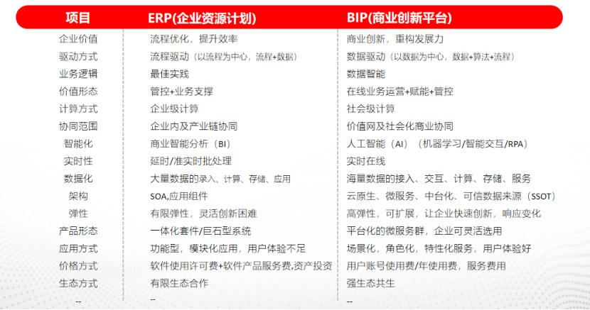 财务中台 中台解释有点太技术,不妨来看看财务中台解释。 财务中台是在业务系统和财务核算系统之间做一个桥梁,通过萃取财务标准化公共能力,连接所有与财务相关的业务、财务、税务、资金、预算等数据,进行筛选、加工(人工或系统规则)、转换,再将转换后的数据提供给财务核算与数据服务系统,从而转变为实现核心财务能力复用的新的财务模式。 中台讲了很多年,最火的时候莫过于阿里建中台那段时间。大潮褪去随着实践的验证,企业也逐渐开始有所取舍,开始思考要不要做中台,自己适合不适合等问题,而不是一股热脑上中台;另外随着技术的进步,一些B端厂商已经逐渐开始把中台的理念融入产品为企业提供服务。终于搞明白中台是什么了?三句话做概括 7. 新一代ERP 新的经济形势对企业管理提出了新的要求,传统的ERP技术在新形势下暴露出数据标准不统一、升级换代成本高、外部协同性差等问题。新一代ERP运用最新的信息技术手段,以微服务架构开发、用数据湖存储、依云平台部署,既克服了传统ERP系统的弊端,也为ERP系统的进一步发展提供了充足动力。(摘自《财务与会计》2022年10期 新一代ERP技术的特征与应用) 用友BIP 如用友提出的新一代产品-商业创新平台BIP,已经不再局限于传统的“财务+进销存”时代,逐步的面向业务领域的管控做衍生,也就是说除了架构新之外,能支撑的企业业务场景也更加丰富。