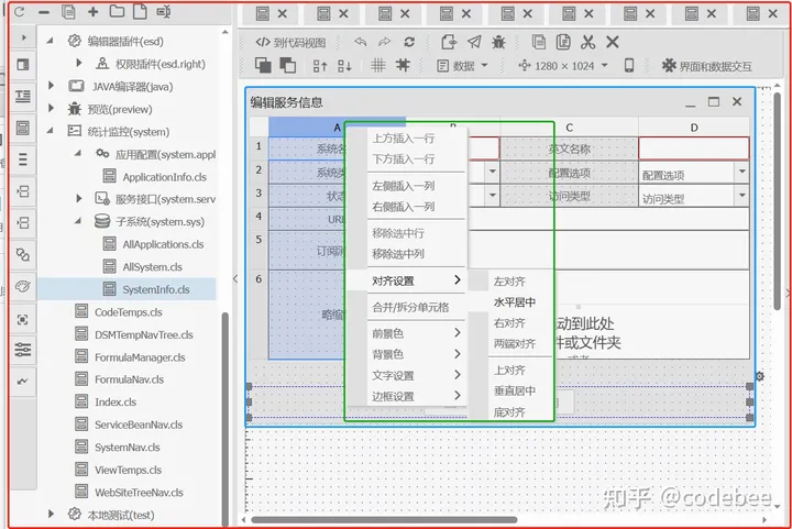 在主体布局上默认采用的表格布局,支持行列的自由拖动,以及行列合并操作。