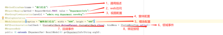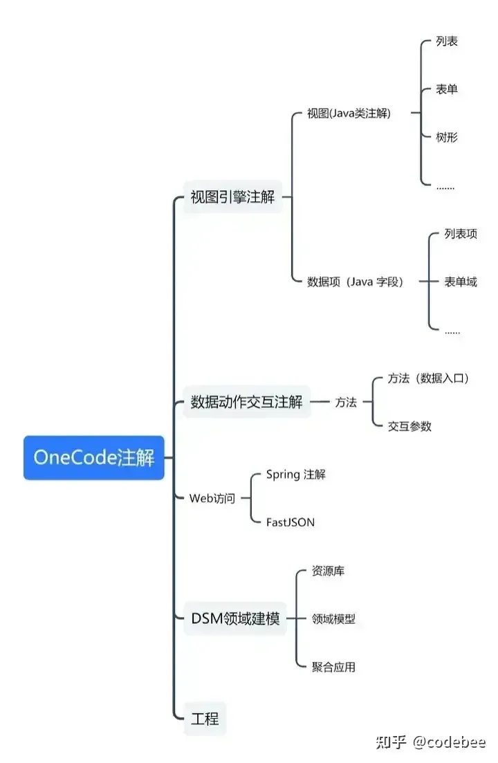 OneCode 本身基于JAVA语言体系,是在Java Spring 注解基础上的一套扩展子集,混合编译引擎器通过扩展注解构建完整的Domain模型,通过读取标准Spring 注解完成普通Web数据交付及调度过程,通过Domin域模型动态渲染JS文件输出为JSON交付给前端引擎构建页面。