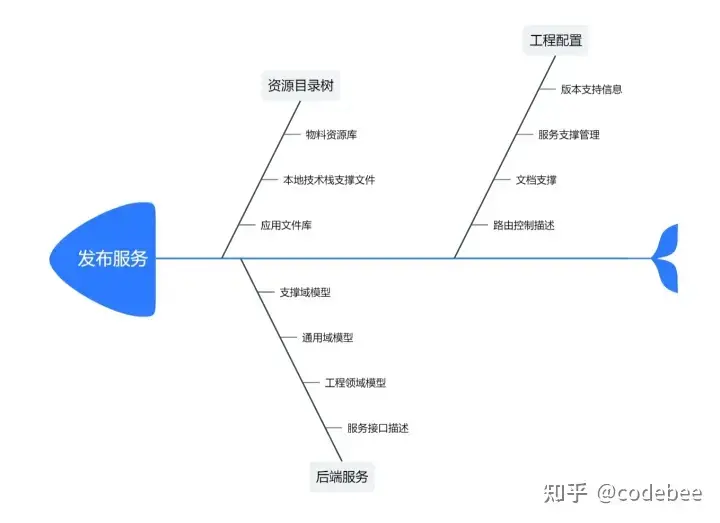 工程发布,需要三方面的资源做支撑,分别是用户通过设计完成的页面及功能交互,通过特定的特定的出码模板完成相应的技术栈前端转换形成的前端页面目录。而后端应用则根据则是用户通过基础数据建模形成的领域模型文件,这些领域模型文件通常会按照,资源库、支撑域工程域等模型方式来独立打包方便后期版本管理及个体更新。另外第三块则是方便工程启动运行以及访问控制,对外暴露监控等相关的工程配置信息。