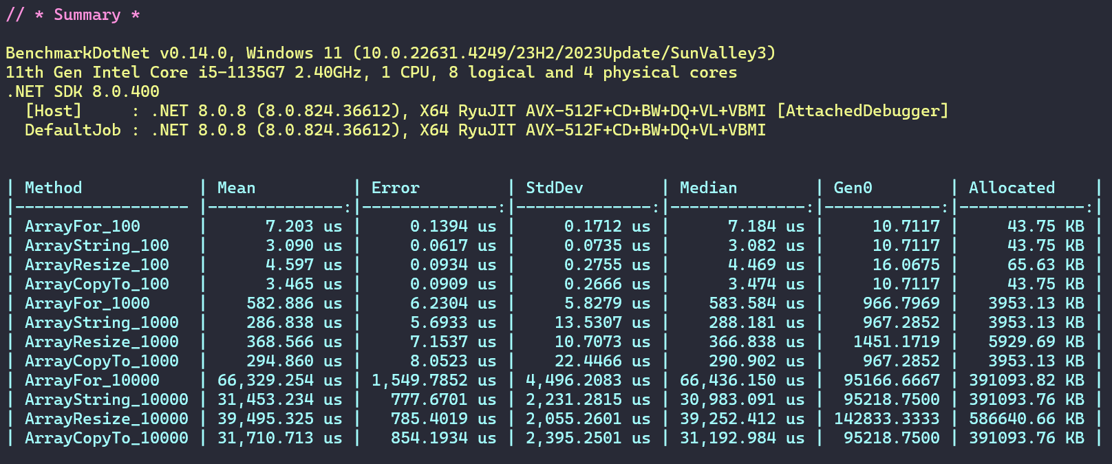 通过测试结果不难发现,CopyTo方法和String方式相对较好,比之StringBuilder方式还要好些。