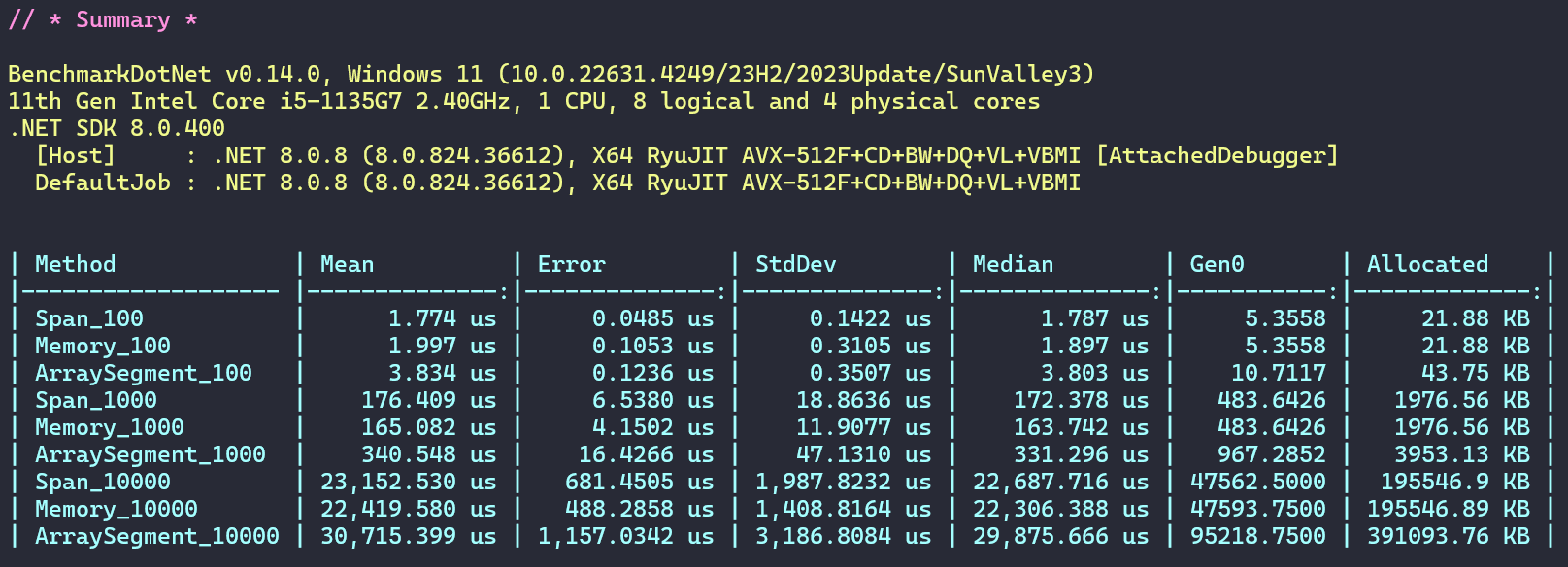 通过测试结果可以发现,三种方法性能都是相当高,当然其中ArraySegment方法相对要差一些。总统来说数据视图方式已经和第一类字符串方式不相上下了。