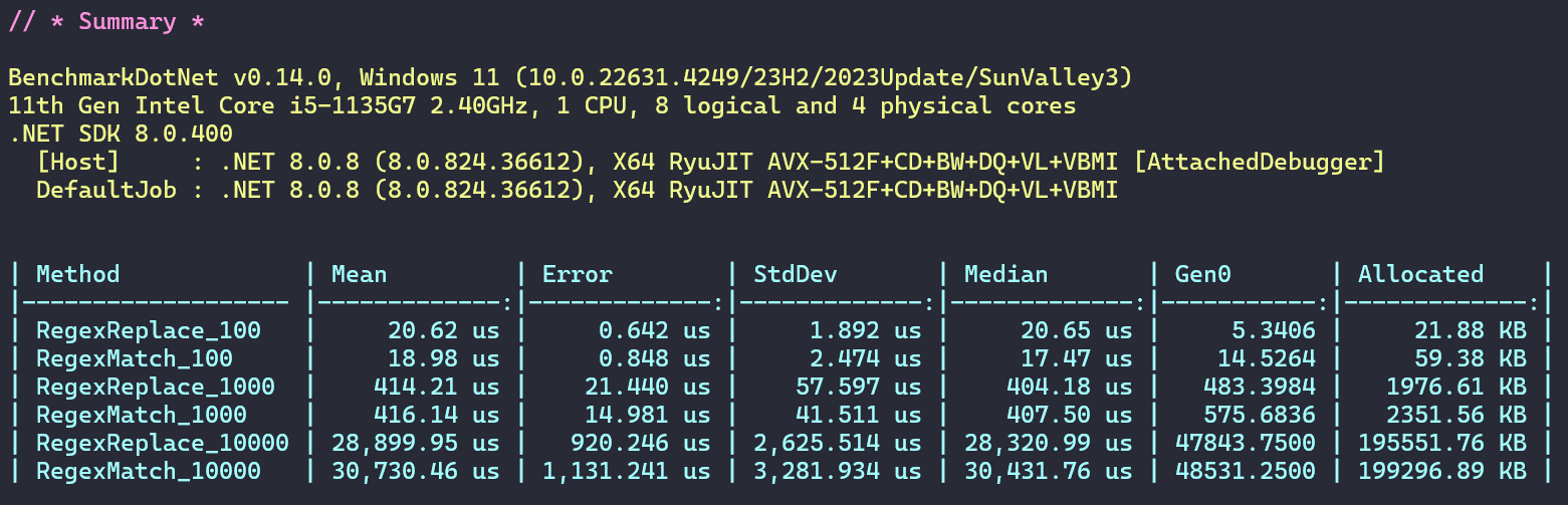 下面我们对两个方法进行三组对比性能测试,每组分别为长度为100、1000、10000的字符串。