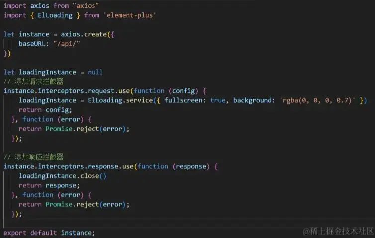 这个方案是最容易想到也是最朴实无华的一个方案:通过使用axios拦截器,在请求拦截器中开启全屏Loading,然后在响应拦截器中将Loading关闭。