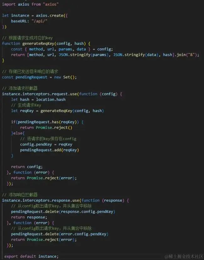 // 添加请求拦截器instance.interceptors.request.use(async (config) => {    let hash = location.hash    // 生成请求Key    let reqKey = generateReqKey(config, hash)