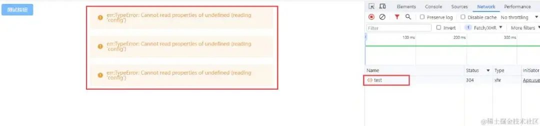 这里我连续点击了4次按钮,可以看到,的确是只有一个请求发送出去,可是因为在代码逻辑中,我们对错误进行了一些处理,所以就将报错消息提示了3次,这样是很不友好的,而且,如果在错误捕获中有做更多的逻辑处理,那么很有可能会导致整个程序的异常。