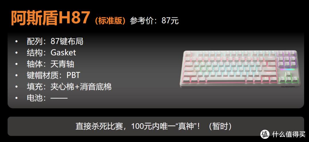 这个键盘已经性价比了很多回了,之前能依靠99元大厂和98配列旋钮做实百元内三幻神的地位,现在100块钱以下的键盘越来越多,这个MK9反而涨价了,所以119元的MK9不推荐。 如果可能的话,还是希望能有一些进步,让MK9以另一种姿态转生。 阿斯盾 H87 标准版