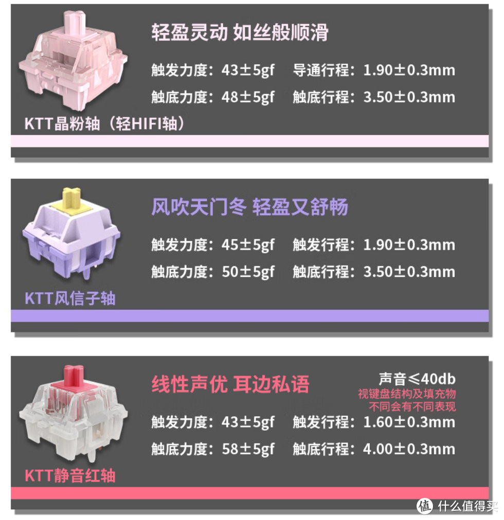 目前有4个轴可选,都是KTT的,一个是晶粉轴,这个比较偏HiFi。另外两个是静音红轴和风信子轴。如果你买来就是想办公的话,建议直接选择静音红轴。