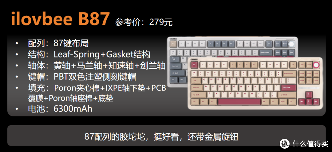 推这个产品的原因主要是VGN也算绕不过去了,这个产品已经快是时代的过去了。 键盘军备竞赛开始时的领跑者,三模、4000mAh电池、传统的PBT键帽、公模的设计,现在看起来也还算能看,只是产品力已经不行了。 但是,149元,还要什么自行车? 、200元-300元这里并不是绞肉机最狠的价位段,毕竟有钱的都买300多的了,没钱的会看更下面的100~200价位段,那才是真正意义的绞肉机。 这里基本都是三模连接了,但是普遍采用公模设计节约成本嘛,理解理解。但是由于预算比100~200价位段多一点,所以普遍开始卷配置了。体验进一步加强。 ilovbee B87