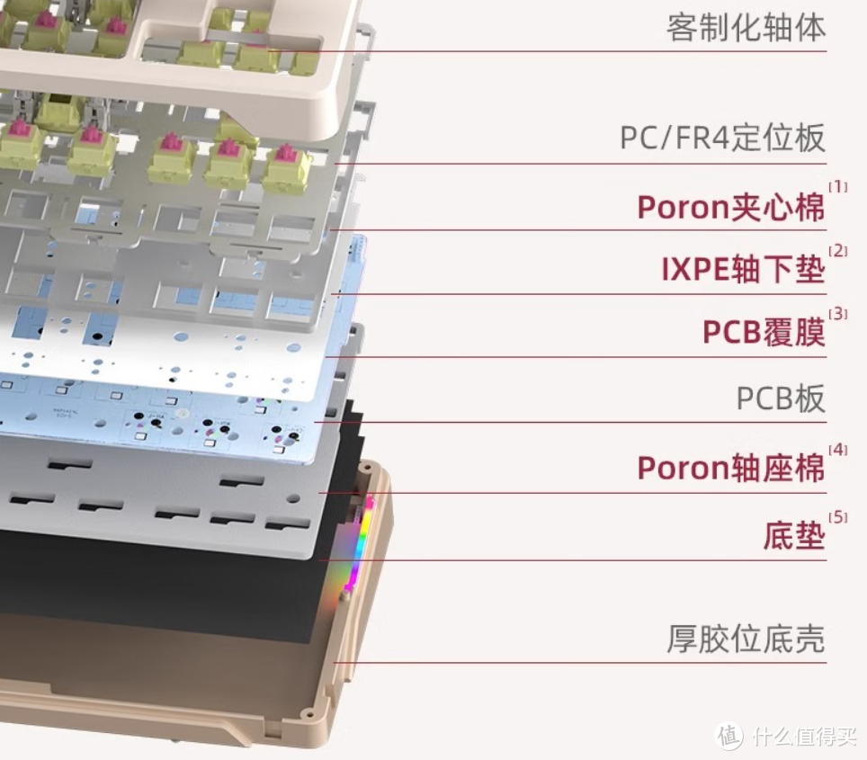 但是推荐B87的原因更多是因为胶坨坨。实际上,跟珂芝K98是一个路数,都是厚胶位注塑,更厚实,更耐摔,更结实。具有铝坨坨的厚重感,同时还能做麻将音,但是没铝坨坨那么贵。 B87只推荐6300mAh版本,高配版的KCA热升华和侧刻渐变俩键帽的版本太贵了。3150mAh电池太小了。划不来。所以,推荐还是推荐中配版本,偏实用主义。 声音填充给了五层,Poron夹心棉+IXPE轴下垫+PCB覆膜+Poron轴座棉+底垫。