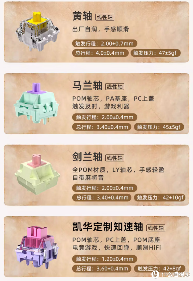 轴体有四款,黄轴和马兰轴绑定低配,不推荐。知速轴和剑兰轴,怎么选?打游戏选触发行程短的知速轴,不打游戏选剑兰轴。