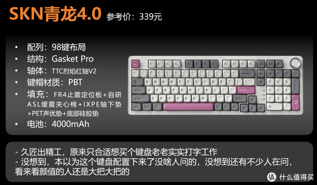 没想到,本以为这个键盘配置下来了没啥人问的,没想到还有不少人在问,看来看颜值的人还是大把大把的。 青龙4.0其实硬碰硬拼刺刀,杀配置并不占优势,但是为啥还有不少粉丝呢? 咱也是后来才发现的,键盘作为工具并不一定参数越高越好用。比如,这个2U长度的的数字0,确实符合大多数人使用习惯。上手就用,敲数字很方便。 旋钮是铝合金的,质感更好,不少人对工具还是有点追求的。 MDA PBT球帽,咱一开始也不习惯球帽。直到真的快速打字习惯之后球帽可以减少误触。 至于HOS轴座,更多是给换轴体的人准备的。不跪脚,就是很牛的设计。 再加上,现在的键盘普遍都是网红脸,白色的塑料外壳,简单配色的PBT键帽,基本都一样。青龙算是这些网红脸里面很有辨识度的了。 对了,既然是叫青龙4.0,那4.0升级了点啥? 新的无线方案,延迟降低,可以打游戏了;新单键键帽,MDA球帽,手感更好;跟随KeyChron支持网页版驱动,一个新配色。 升级更多是细节打磨,而非大改,客观来说,在同行很卷的2024年SKN青龙4.0的产品竞争力本应是下降的,但是它还卖339元的原价,加量不加价,也算是找回场子了。 这个键盘定位 工具性键盘,SKN是Keychron的子品牌=售后是Keychron。所以,这个键盘合适只想买个键盘老老实实打字工作,下班想打个游戏的人。所以,整体算是98配列里很不错的键盘。 对了,顺带一提,现在青龙4.0支持网页驱动啦!其实青龙不止支持VIA改键,甚至可以做到网页改键~