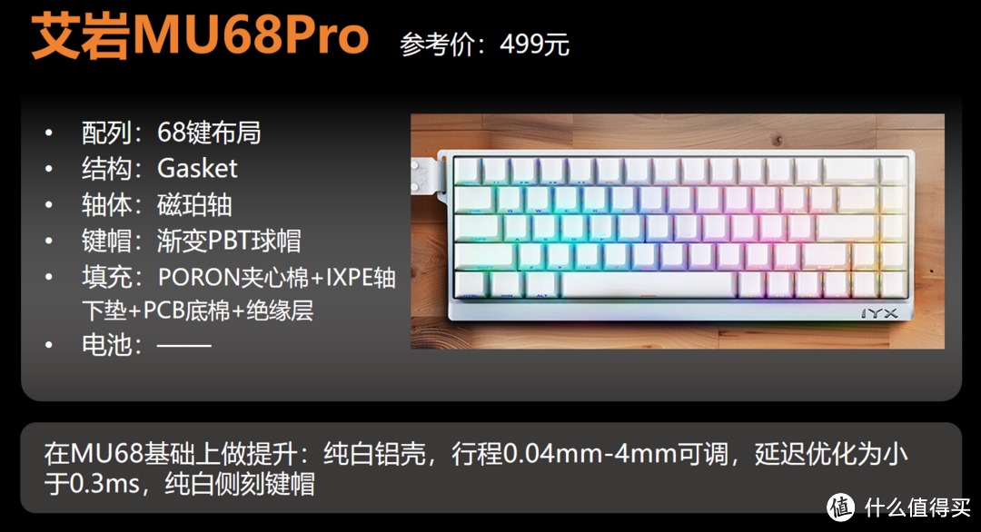 MU68Pro延续了之前MU68借鉴Wooting的经验,在MU68基础上做了一些简单提升:铝坨坨外壳更换为全白色和飘带,升级为侧刻键帽。可调行程也进步为0.04mm-4mm可调,传输延迟优化为小于0.3ms。 这些升级只加50块,算是很不错了。无论是可调行程的进步还是传输延迟的降低,对磁轴键盘体验有很大提升。 吐槽一下,不少键盘厂为了区分Pro和原版都给Pro版本采用侧刻键帽。其实并不实用。 MU68Pro这次升级咱认为更多是给白色全家桶用户的新选择,目前白色的性价比磁轴铝坨坨还有谁吗?可能也就这个能选。 白色看似容易脏,其实恰恰相反,原来黑色的反而更容易脏。白色的外壳和键帽虽然也沾指纹,但是完全看不出来。咱认为这是一个巨大的隐藏升级。 客观来看499元确实有点贵,但是对比竞品,发现其实还好……所以,MU68Pro刚出来就断货了,黄鱼甚至有人加价卖。 现在来看,MU68Pro依然没啥对手,除了下位替代的狼蛛Win68,还有中间的珂芝G68SE。 达尔优A75HE