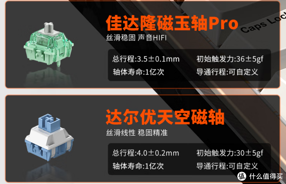 轴体只有两款可选,除了最高配的999元是佳达隆磁玉轴Pro(没想到,那个999元定位居然是陶瓷键帽),其他配置全部都是达尔优的天空磁轴,带防尘壁,稳定性有保障。 而且初始触发力只需要30g,算是目前咱见过的磁轴里最轻的。这个触发就很很合适打游戏。