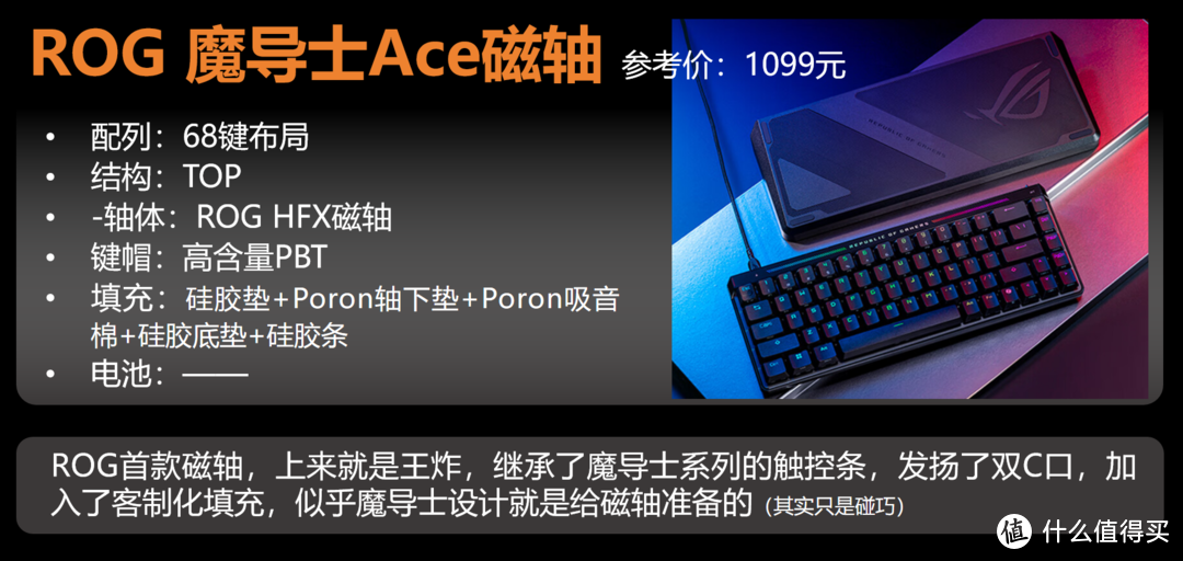 800+以上的键盘普遍以整活为主,各家都会拿出自己的骚操作,让自家德国红点设计奖之类的产品硬碰硬,可以说大佬打架。说句不好听的就是“吃饱了撑得”,正因为产品预算足够,所以各种骚操作才能施展开。 ROG 魔导士Ace磁轴