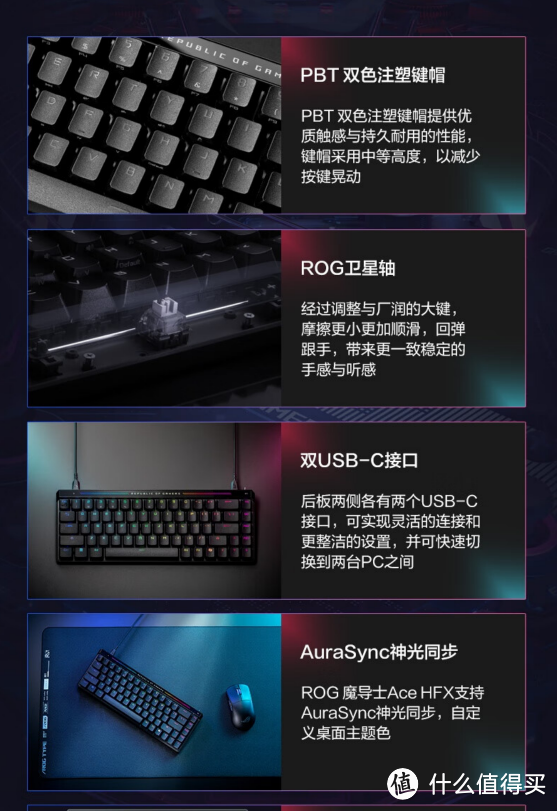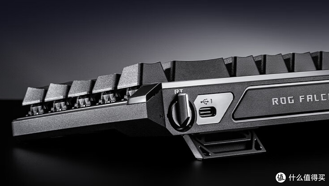ROG这个磁轴键盘,完成度很高,甚至可以借助Smart Bar触控条直接修改轴体触发行程。ROG 魔导士ACE HFX依然采用65键布局,算是延续魔导士小键盘的整体思路。 轴体采用ROG HFX磁轴,瑞翼鲨代工,初始压力40gf,触底压力55gf。POM轴心+PC上盖。回弹有力,打字也可以用。 键帽有ABS和PBT两个版本,PBT也做了字透,PBT版本贵100块钱,但是值得。磁轴键盘普遍都是有线单模,ACE HFX也不例外。 ROG魔导士曾经的拿手绝活:左右双C口,在这里优势非常大。这点看起来没啥,如果你桌子比较小,很难排开位置,你就会发现这个设计的价值。