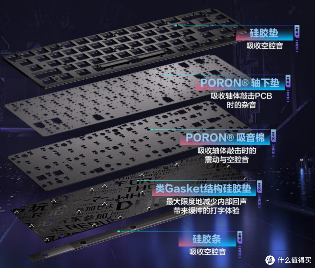 还有一个有意思的功能SpeedTap,开启后同时按下两个按键会先输入后者,并自动释放前者。尤其是身体无法跟上大脑思考的情况下,键盘会帮你执行释放键盘的操作,这很符合人脑直觉。 甚至这个键盘还做了5层填充,硅胶垫+Poron轴下垫+Poron吸音棉+硅胶底垫+硅胶条,这算是象征ROG正式加入客制化队伍。