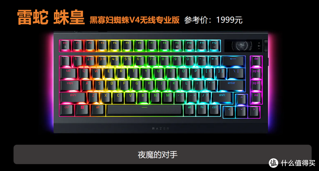 雷蛇拿出来了对标夜魔的旗舰产品。 这个旗舰最大的特色就是无线4KHz回报率和OLED屏幕,屏幕支持查询PC指标、键盘状态、自定义动画和可视化音频计。 标配雷蛇第三代触感橙轴,热插拔自然不会少,可以换轴,支持3针和5针两种,不过你换的轴可能不如原装。 支持单键盘独立灯光设置。这个键盘作为旗舰定位,填充也要做,安排了FR4 定位板、两层消音棉。并且做了出厂润轴。 雷蛇一直送的磁吸式PU皮掌托,蛛皇也有,不用额外买了。简而言之,夜魔的对手。