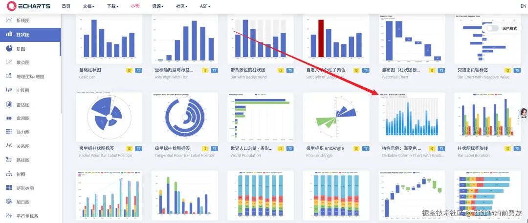 然后咱们去Echarts官网,我挑一个图表,用来演示一下:(挑一个好看的)