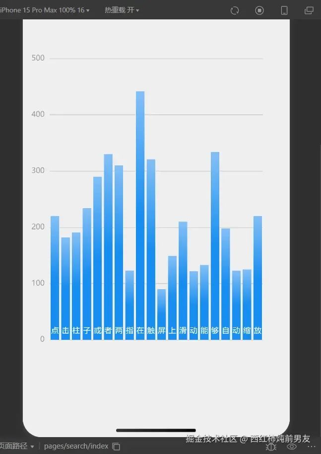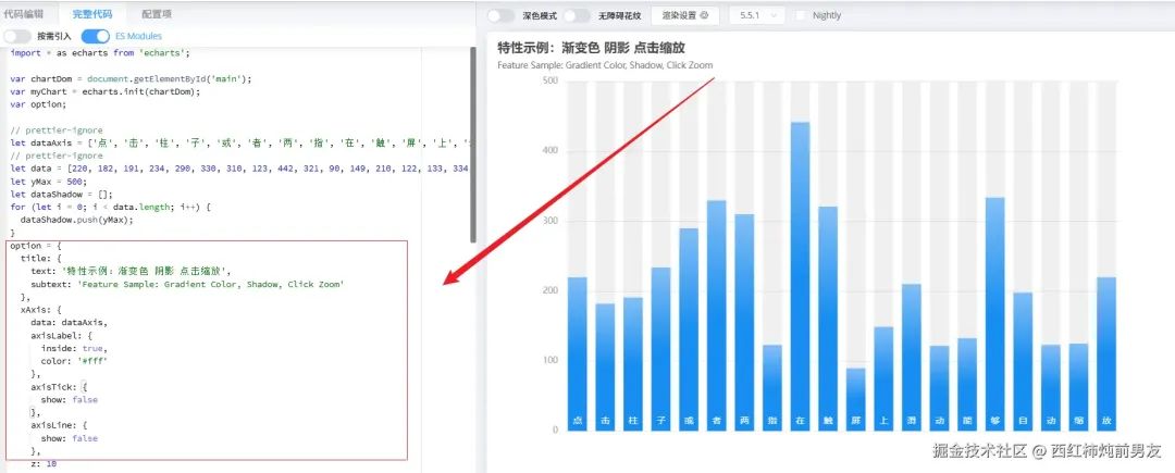initChart(canvas, width, height, canvasDpr) {      let chart = echarts.init(canvas, null, {        width: width,        height: height,        devicePixelRatio: canvasDpr      });      canvas.setChart(chart);      let option = {        xAxis: {          data: ['点', '击', '柱', '子', '或', '者', '两', '指', '在', '触', '屏', '上', '滑', '动', '能', '够', '自', '动', '缩', '放'],          axisLabel: {            inside: true,            color: '#fff'          },          axisTick: {            show: false          },          axisLine: {            show: false          },          z: 10        },        yAxis: {          axisLine: {            show: false          },          axisTick: {            show: false          },          axisLabel: {            color: '#999'          }        },        dataZoom: [          {            type: 'inside'          }        ],        series: [          {            type: 'bar',            itemStyle: {              color: new echarts.graphic.LinearGradient(0, 0, 0, 1, [                { offset: 0, color: '#83bff6' },                { offset: 0.5, color: '#188df0' },                { offset: 1, color: '#188df0' }              ])            },            emphasis: {              itemStyle: {                color: new echarts.graphic.LinearGradient(0, 0, 0, 1, [                  { offset: 0, color: '#2378f7' },                  { offset: 0.7, color: '#2378f7' },                  { offset: 1, color: '#83bff6' }                ])              }            },            data: [220, 182, 191, 234, 290, 330, 310, 123, 442, 321, 90, 149, 210, 122, 133, 334, 198, 123, 125, 220]          }        ]      };      chart.setOption(option);      console.log('chart', chart.getOption());      const dataAxis = chart.getOption().xAxis[0].data;      const zoomSize = 6;      let data = [220, 182, 191, 234, 290, 330, 310, 123, 442, 321, 90, 149, 210, 122, 133, 334, 198, 123, 125, 220];      chart.on('click', function (params) {        // console.log(this.dataAxis[Math.max(params.dataIndex - zoomSize / 2, 0)]);        chart.dispatchAction({          type: 'dataZoom',          startValue: dataAxis[Math.max(params.dataIndex - zoomSize / 2, 0)],          endValue: dataAxis[Math.min(params.dataIndex + zoomSize / 2, data.length - 1)]        });      });      return chart;