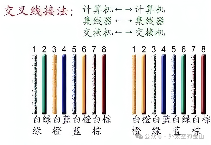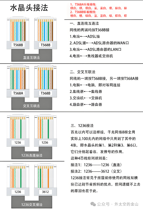 在100M的网络传输,实际只使用了1、2、3、6四根线,也就是橙白、橙、绿白、绿这四根线。其中1、2线用于发送数据,3、6线用于接受数据,4、5线为备用线 ,7、8线则为电话线。网线水晶头需要按照标准的线序来做,由于网线的双绞结构,使得网线的每一对线芯绞距、绕线方向、绕线圈数都是不同的。实验测得网线按照标准的线序来接,网线的干扰最小,传输效果最佳。在网线水晶头制作时,标准的接法有两种:T568A和T568B。