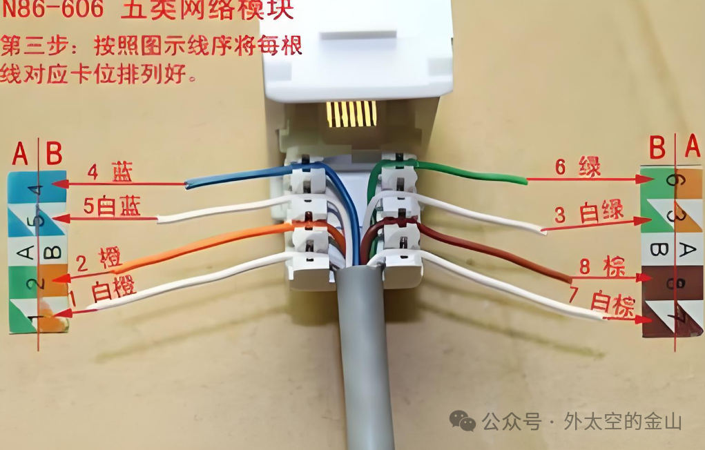 T568A线序:1.绿白,2.绿,3.橙白,4.蓝,5.蓝白,6.橙,7.棕白,8.棕;