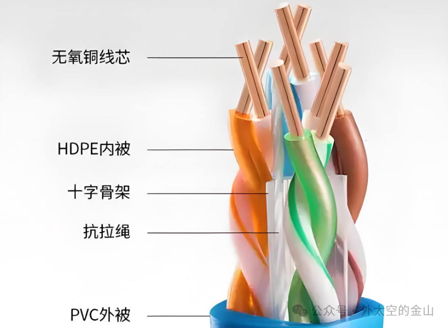 一般我们把网线买回来的时候在外层表皮会看到双绞线的类别标识以及屏蔽方式,如类别CAT5E、CAT6、CAT6A以及屏蔽方式FTP、SFTP等。