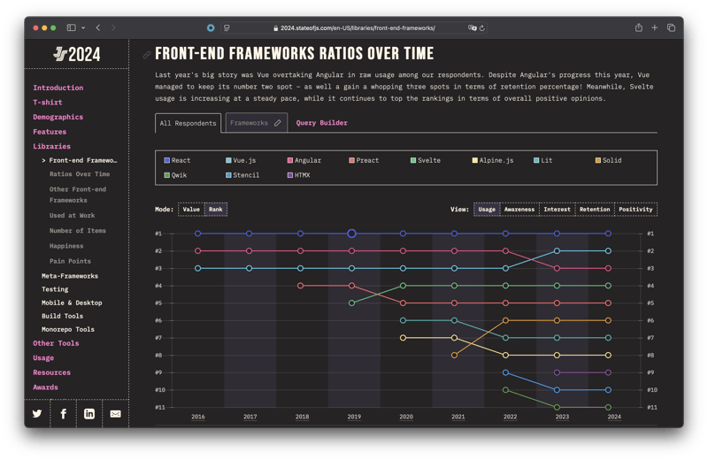 在深入探究细节以前,咱们先来瞧瞧这些框架的受欢迎程度。在这一方面,我最为青睐的指标是 “JavaScript 状态调查”。由 Devographics 每年开展一次的这项调查,其最新的结果于 2024 年底公布 —— 恰好在这篇博客文章发布的几天之前。🔥
