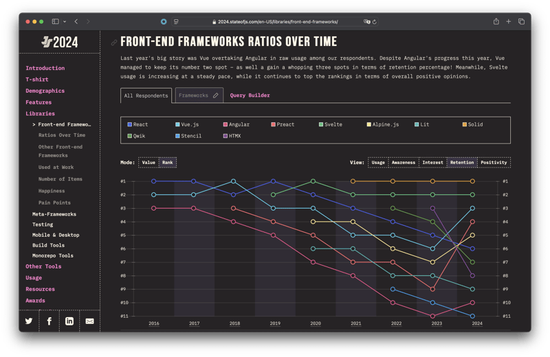 Vue.js:这颗冉冉升起的新星,以 51%的使用率位居第二,首次超越了 Angular。在 2024 年,人们对它的满意度也在迅速提升:留存率为 75%(总体排名第三),积极度为 70%(总体排名第二),这使得它首次超越了 React。