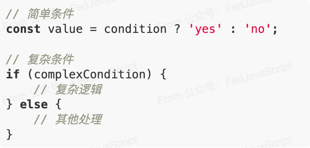 优先使用三元运算符代替简单的if-else语句,复杂逻辑保持if-else结构。