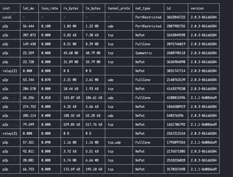 同理,如果需要查看节点信息,可以使用docker exec -it easytier easytier-cli peer命令