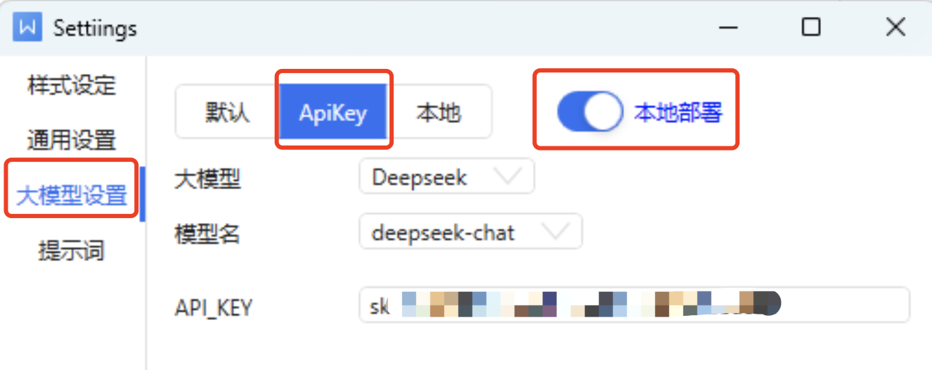 (3)在“设置”窗口中,选择“大模型设置”,打开“本地部署”开关,选择“ApiKey”标签
