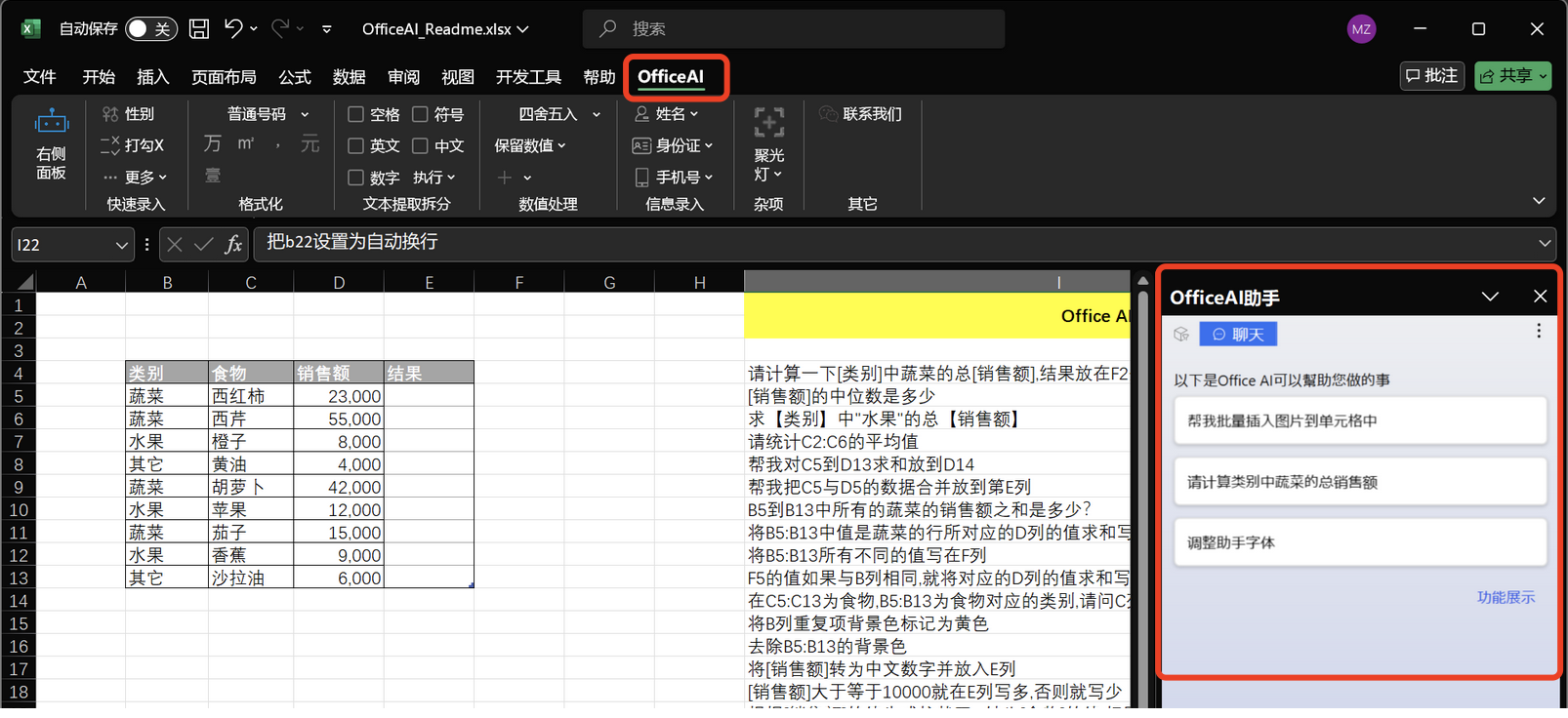 OfficeAI 助手 是一款免费的智能AI办公工具软件,专为 Microsoft Office 和 WPS 用户打造。 使用场景:寻找如何输入“打勾(✔️)符号”的方法,想知道“怎么在插入表格前添加文字”,或者“该用哪个公式”, AI办公助手都能为你提供快速、准确的解决方案。 通过简单的指令,ExcelAI 插件可以帮你自动完成复杂的公式计算、函数选择。 WordAI 插件还具备整理周报、撰写会议纪要、总结内容、以及文案润色等功能。