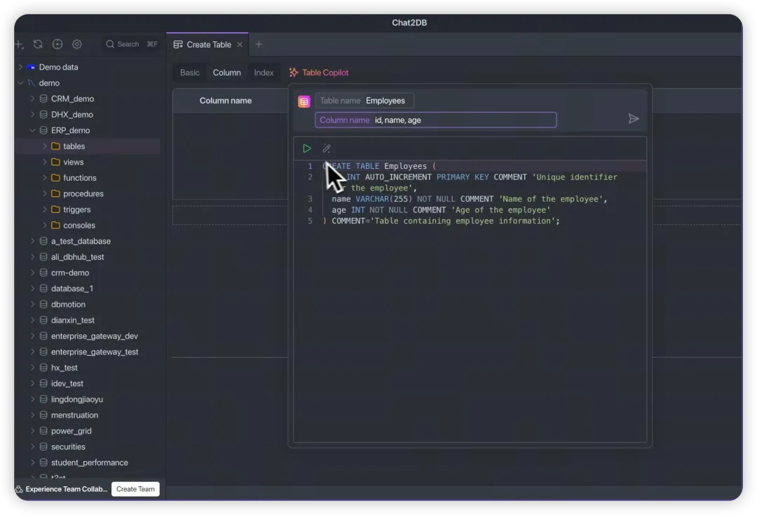 在设计数据库表时,通常需要逐个输入字段,同时还要考虑命名、长度设置和索引建立等问题,费时费力。Chat2DB能够在几秒钟内完成这些设计,让你有更多时间思考午餐吃什么。