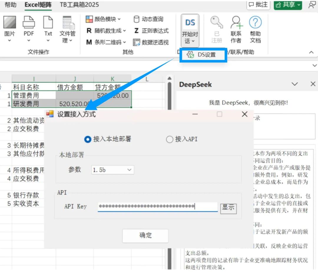 将DeepSeek接入Excel,为你带来前所未有的交互体验!“哪里不懂,选中哪里”,然后直接在侧边栏对话框向DeepSeek发问,非常地方便!案例演示设置接入方式既可以通过本地部署的DeepSeek接入Excel,也可以通过Api key访问DeepSeek接入Excel。设置接入方式