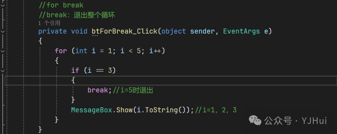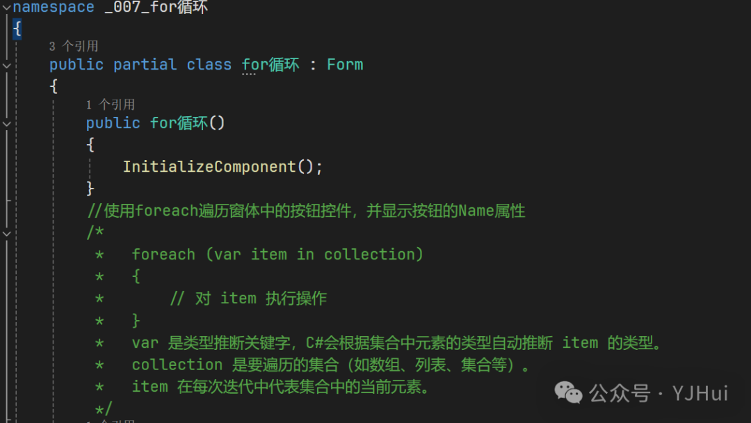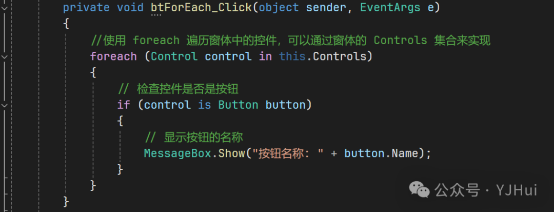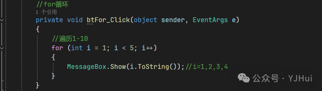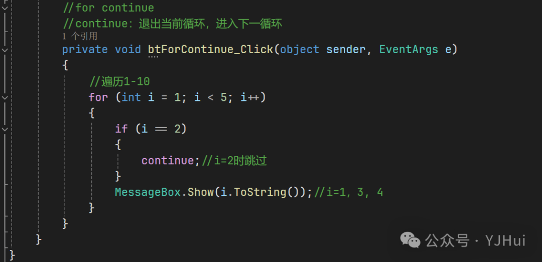 namespace _007_for循环{    public partial class for循环 : Form    {        public for循环()        {            InitializeComponent();        }        //使用foreach遍历窗体中的按钮控件,并显示按钮的Name属性        /*         *   foreach (var item in collection)           *   {           *       // 对 item 执行操作           *   }          *   var 是类型推断关键字,C#会根据集合中元素的类型自动推断 item 的类型。         *   collection 是要遍历的集合(如数组、列表、集合等)。         *   item 在每次迭代中代表集合中的当前元素。         */        private void btForEach_Click(object sender, EventArgs e)        {            //使用 foreach 遍历窗体中的控件,可以通过窗体的 Controls 集合来实现            foreach (Control control in this.Controls)            {                // 检查控件是否是按钮                  if (control is Button button)                {                    // 显示按钮的名称                      MessageBox.Show("按钮名称: " + button.Name);                }            }        }        //for循环        private void btFor_Click(object sender, EventArgs e)        {            //遍历1-10            for (int i = 1; i < 5; i++)            {                MessageBox.Show(i.ToString());//i=1,2,3,4            }        }        //for break        //break:退出整个循环        private void btForBreak_Click(object sender, EventArgs e)        {                        for (int i = 1; i < 5; i++)            {                if (i == 3)                {                    break;//i=5时退出                }                MessageBox.Show(i.ToString());//i=1,2,3            }                    }        //for continue               //continue:退出当前循环,进入下一循环        private void btForContinue_Click(object sender, EventArgs e)        {            //遍历1-10            for (int i = 1; i < 5; i++)            {                if (i == 2)                {                    continue;//i=2时跳过                }                MessageBox.Show(i.ToString());//i=1,3, 4            }        }    }}