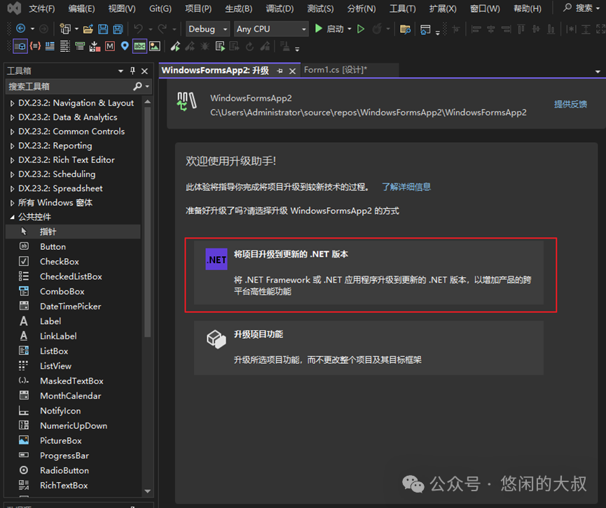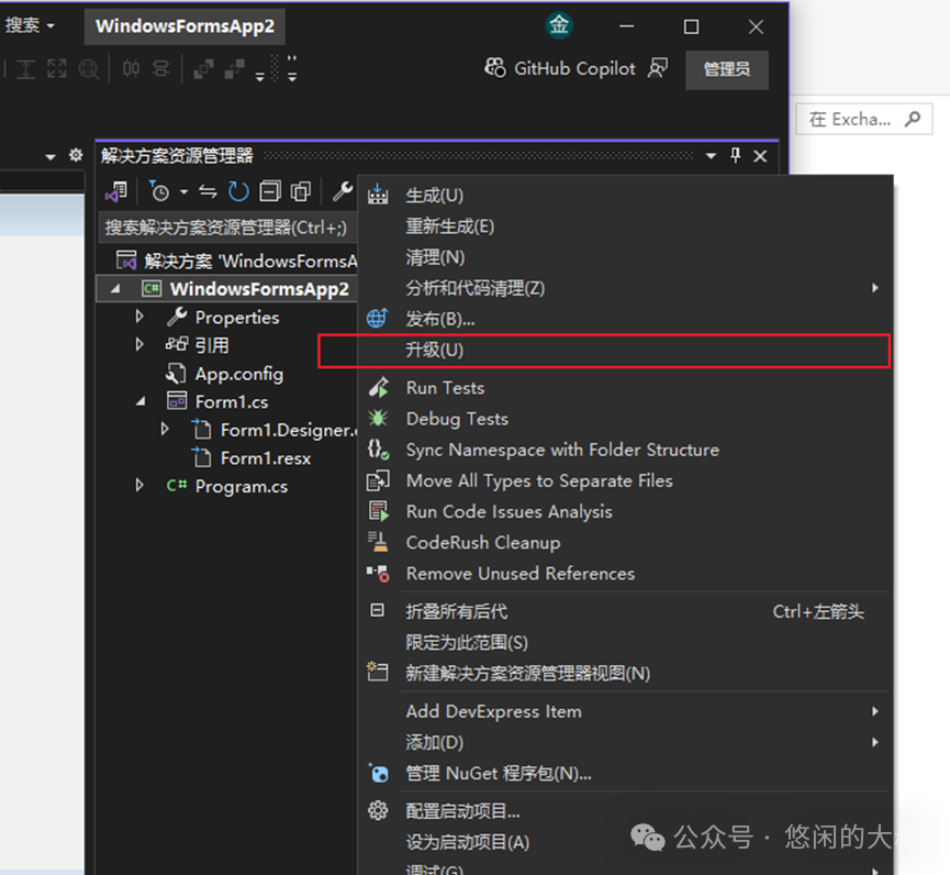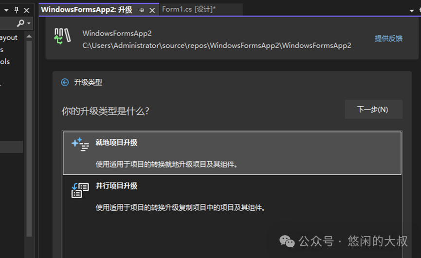 在项目中,选中要升级的Project,右键弹出菜单选择“Update”,第一次升级是英文“Update”,这时VS2022 会下载升级包,根据升级包升级,菜单变成中文格式“升级”,点“升级”,一步一步根据向导执行。
