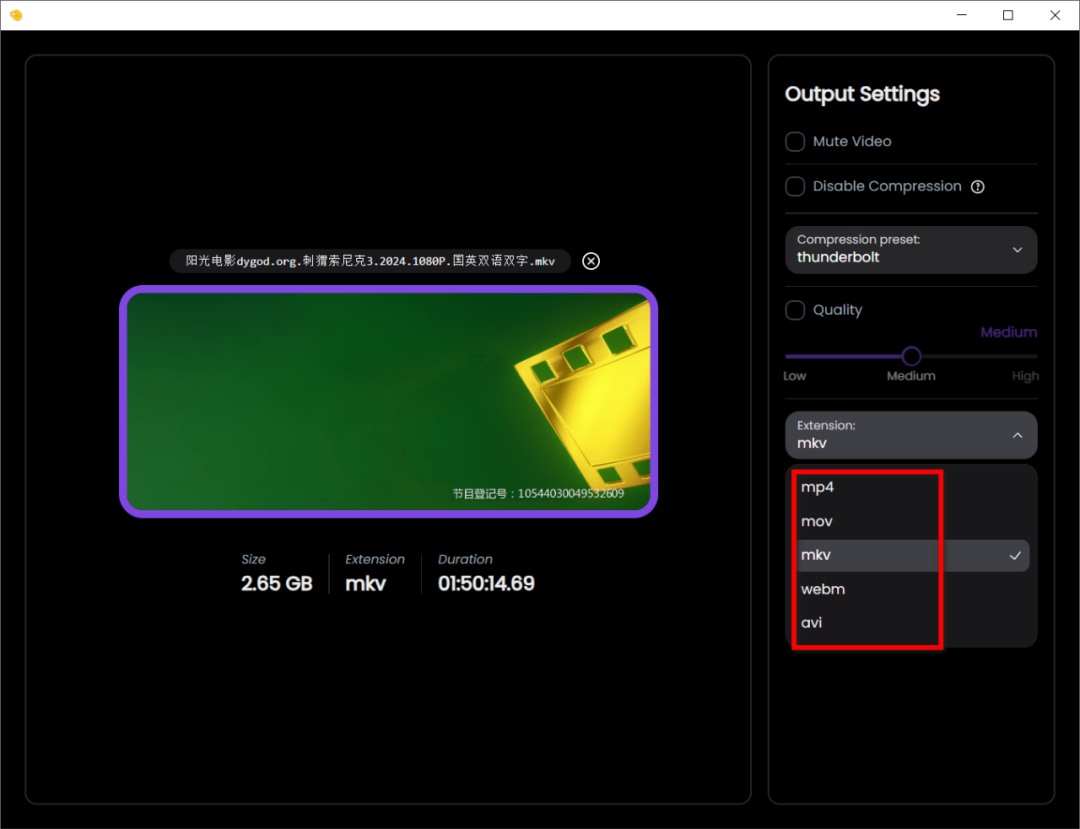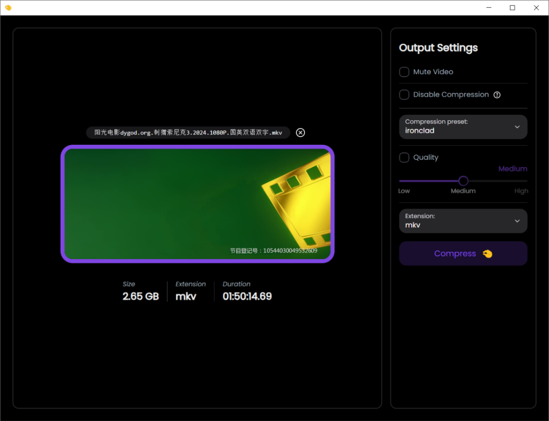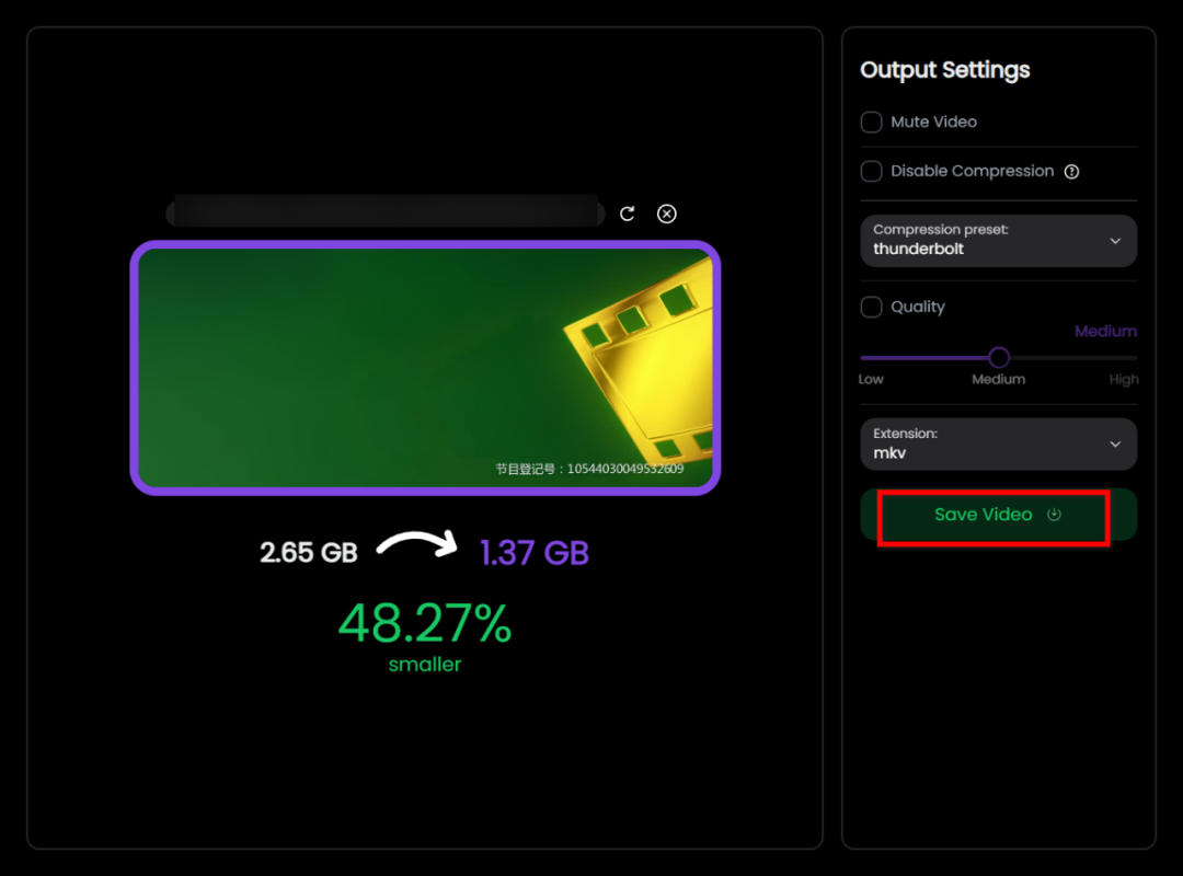支持文件拖入添加,支持输出格式选择,压缩质量默认中等其实就行了,然后点击压缩,压缩完成后记得点击Save Video保存