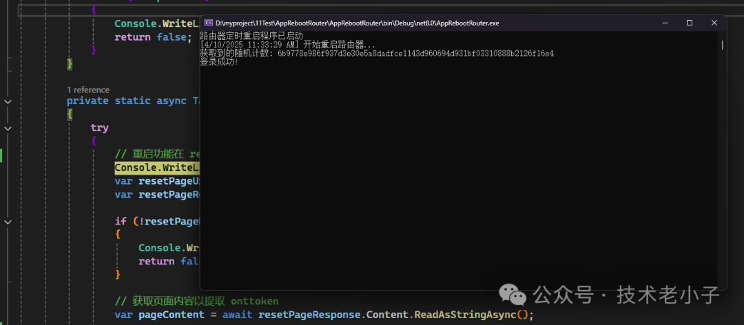 private static async Task< bool > ExecuteReboot() { try { // 重启功能在 resetfactory.asp 页面 Console.WriteLine( "访问重启页面..." ); var resetPageUrl = "/html/ssmp/restore/resetfactory.asp" ; var resetPageResponse = await client.GetAsync(resetPageUrl); if (!resetPageResponse.IsSuccessStatusCode) { Console.WriteLine($ "访问重启页面失败,状态码: {resetPageResponse.StatusCode}" ); return false ; } // 获取页面内容以提取 onttoken var pageContent = await resetPageResponse.Content.ReadAsStringAsync(); // 匹配模式 <input type="hidden" name="onttoken" id="hwonttoken" value="..."> var tokenMatch = Regex.Match(pageContent, @ "<input\s+type=" "hidden" "\s+name=" "onttoken" "\s+id=" "hwonttoken" "\s+value=" "([^" "]+)" "" , RegexOptions.IgnoreCase); if (!tokenMatch.Success) { Console.WriteLine( "无法找到onttoken值" ); return false ; } string tokenValue = tokenMatch.Groups[ 1 ].Value; Console.WriteLine($ "获取到的onttoken值: {tokenValue}" ); // 设置重启请求的引用页 client.DefaultRequestHeaders.Referrer = new Uri($ "{routerAddress}{resetPageUrl}" ); // 准备重启请求参数 var rebootParams = new Dictionary< string , string > { { "x.X_HW_Token" , tokenValue } }; // 创建重启请求内容 var rebootContent = new FormUrlEncodedContent(rebootParams); // 发送重启请求 var rebootUrl = "set.cgi?x=InternetGatewayDevice.X_HW_DEBUG.SMP.DM.ResetBoard&RequestFile=html/ssmp/restore/resetfactory.asp" ; var rebootResponse = await client.PostAsync(rebootUrl, rebootContent); if (rebootResponse.IsSuccessStatusCode) { Console.WriteLine( "重启命令已成功发送" ); return true ; } else { Console.WriteLine($ "重启命令发送失败,状态码: {rebootResponse.StatusCode}" ); var responseContent = await rebootResponse.Content.ReadAsStringAsync(); Console.WriteLine($ "响应内容: {responseContent}" ); return false ; } } catch (Exception ex) { Console.WriteLine($ "执行重启时出错: {ex.Message}" ); return false ; } } 完整代码示例 下面是完整的定时重启路由器程序代码: