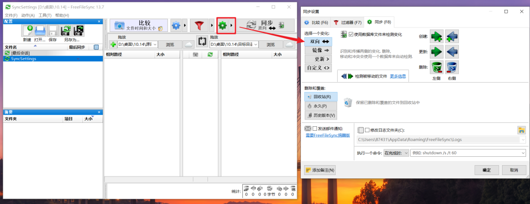 双向同步(默认):识别左右两个目录中文件的异同,同步后双方文件及结构保持相同