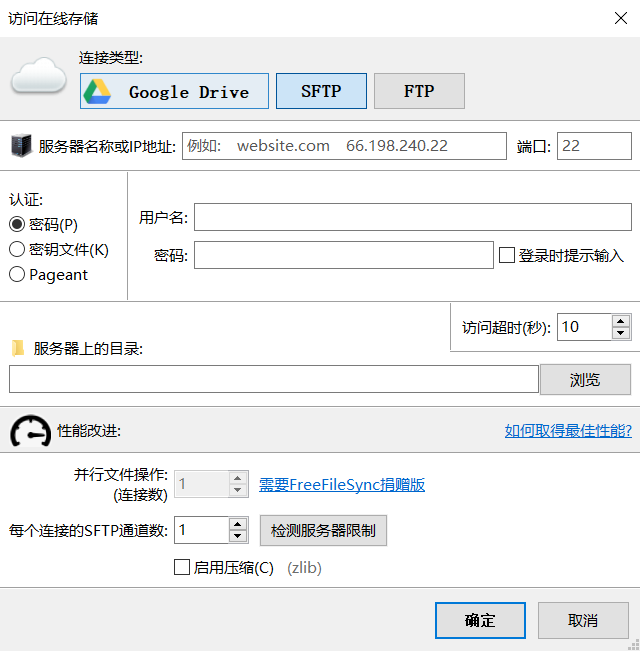 FreeFileSync 还支持 Google Driver、SFTP 和 FTP 三种远程方式进行文件的同步与备份。