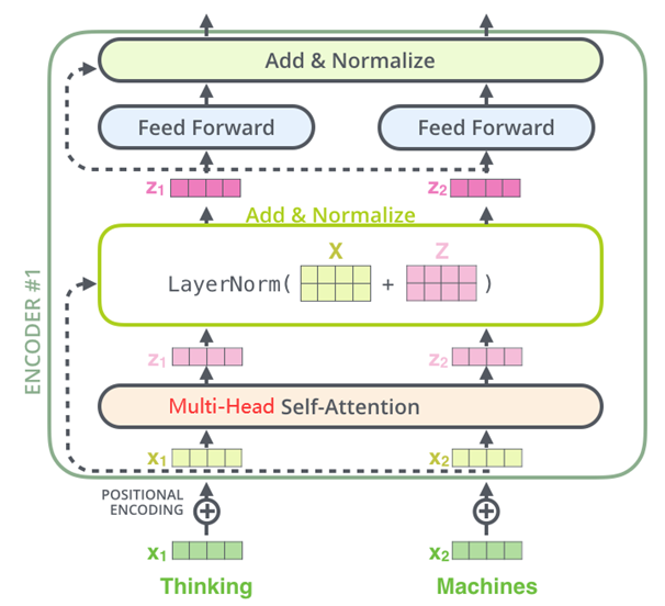 每个编码器层由两个子层连接结构组成:第一个子层是一个多头自注意力子层,第二个子层是一个前馈全连接子层。每个子层后都接有一个规范化层和一个残差连接。
