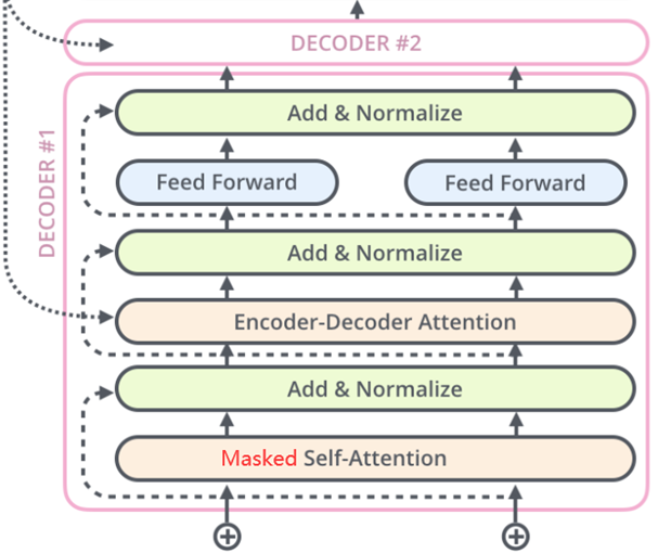 每个解码器层由三个子层连接结构组成:第一个子层是一个带掩码的多头自注意力子层,第二个子层是一个多头注意力子层(编码器到解码器),第三个子层是一个前馈全连接子层。每个子层后都接有一个规范化层和一个残差连接。