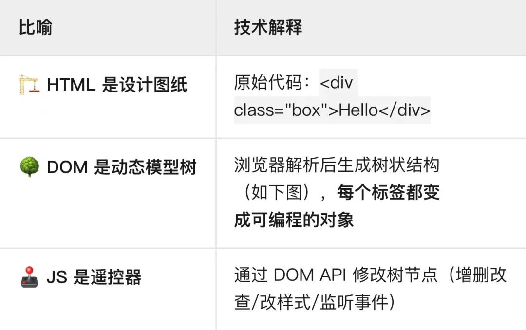 💡 重要性:DOM 是网页变成动态应用的核心枢纽,没有它 JavaScript 无法修改页面。 超直观案例演示: