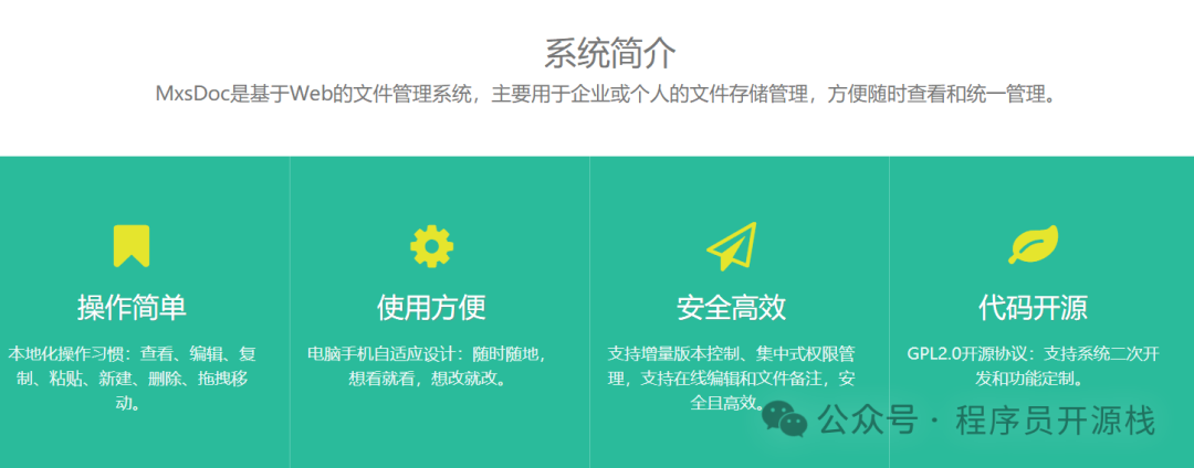 项目特点1、功能全面:从基础文件管理到高级协同功能一应俱全。 2、部署简单:支持一键安装,解压即用,适合个人和团队快速上手。 3、跨平台支持:可在 Windows、Linux、Mac 上运行。 4、安全可靠:具备文件加密、权限控制、自动备份、回收站等功能。 5、扩展性强:支持集群部署、第三方接入、数据库扩展等。 6、兼容性好:支持 FTP、SFTP、SMB、远程共享目录等多种文件访问方式。 7、支持AI接入:可接入主流大模型,提升系统智能化水平。 8、开源免费:社区版完全免费,专业版和企业版提供更高级功能。 项目技术MxsDoc 采用的是传统的 Web 架构,主要基于 Java 技术栈,使用 Tomcat 作为 Web 容器: